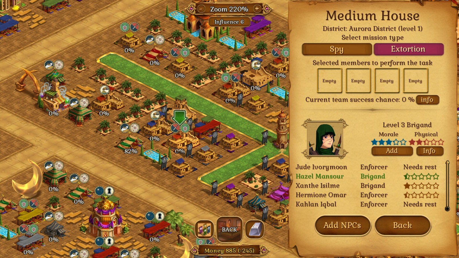 You now have the task of establishing this guild, first by ensuring a steady income, then by becoming the dominant underworld power in each of Dingirra's quarters. In the beginning of the game, four fifths of the city are controlled by the Four Families, the fifth is more or less public and under the Grand Mogul's protection. As your organization grows in size and influence, the four families may seek your services. However, your ultimate objective is to defeat them all and fully conquer the town of Dingirra.
